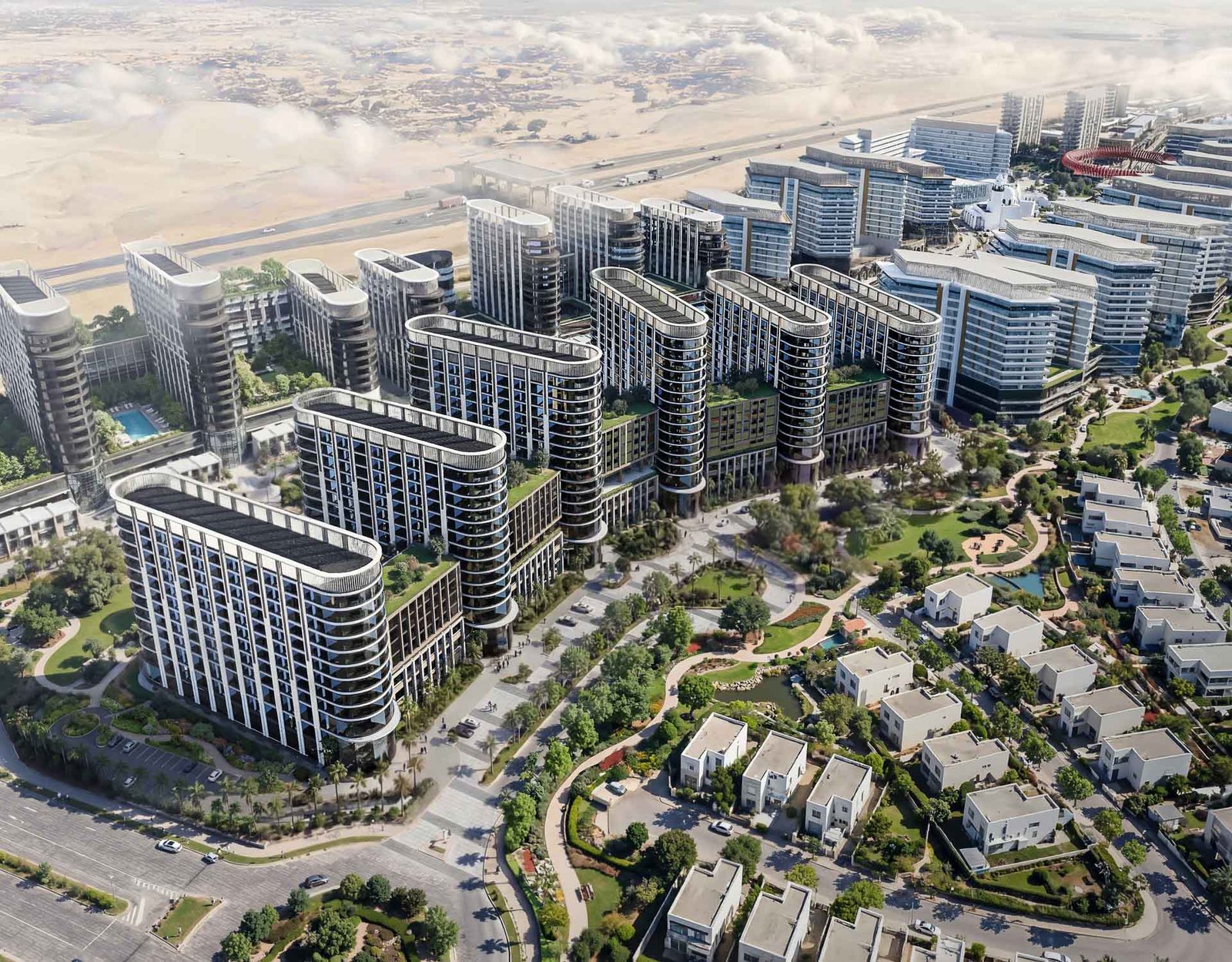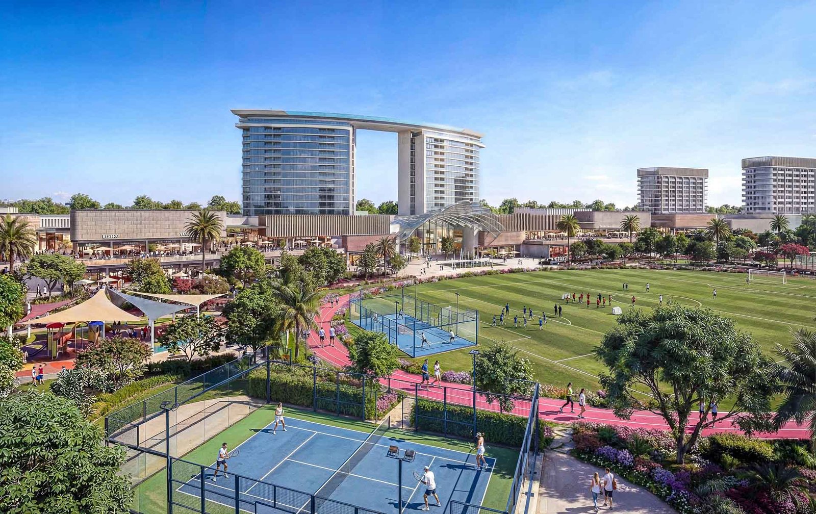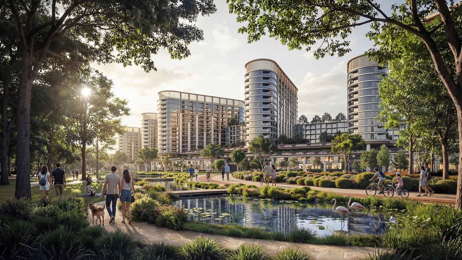 Forest-inspired villa neighbourhoods and contemporary residences are arranged around a vast central park and a continuous green spine, alongside a community mall, wellness centre, schools, healthcare facilities, and curated lifestyle amenities, creating a setting where wellbeing and modern living come together naturally.